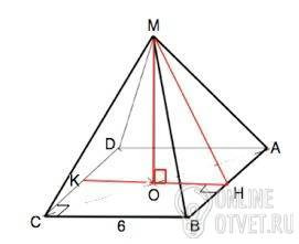 В правильной пирамиде высота проходит через центр основания. Для квадрата это точка пересечения диагоналей. МО – высота пирамиды, МН –апофема.