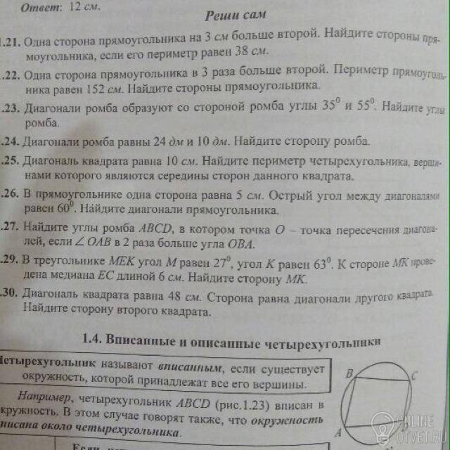 На 21 решение: (Х+Х+3)*2=38 4Х+6=38 4Х=32 Х=8 Одна сторона 8 см. Вторая 11 см. На 22 решение: (3Х+Х)*2=152 8Х=152 Х=19 Одна сторона 19 см. Вторая 57 см.