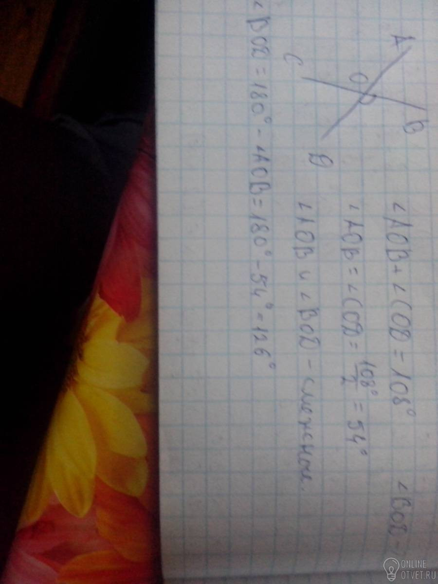 Сумма вертикальных углов AOB и COD, образованных при пересечении прямых AD и BC, равна 108°. Найдите угол BOD.