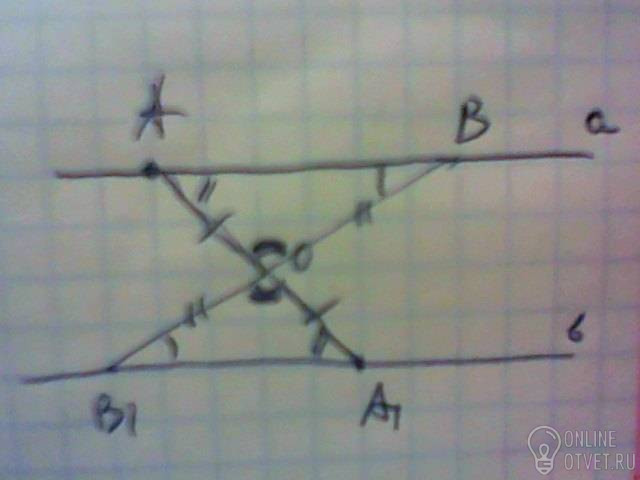 Чтобы доказать , что а║b, необходимо рассмотреть ΔАОВ=ΔА1ОВ1 (две стороны одного треугольника равны двум сторонам другого треугольника по построению и вертикальные углы прямые. А дальше рассматриваем утверждение "если две прямые пересекаются третьей прямой (секущей) и при этом разносторонние навкрест лежащие углы равны, то прямые а и b параллельные.Как видите, доказательство очень длинное. Проще было бы через скайп. Попробуйте.