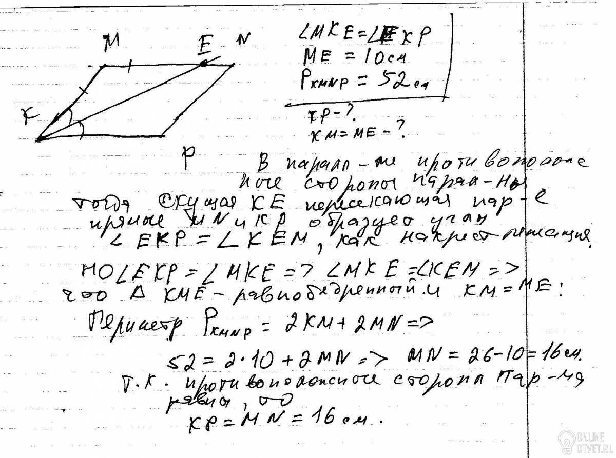 б)Найдите сторону KP, если ME=10см,а периметр параллелограмма равен 52 см.