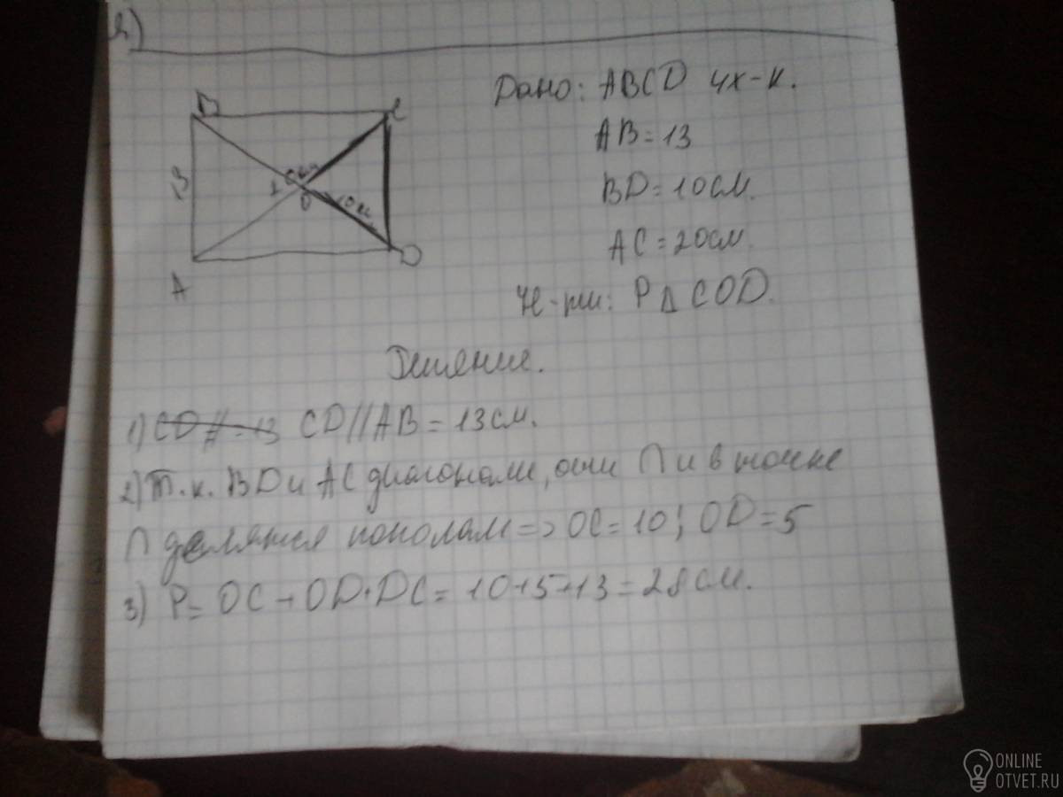 В четырёшуголиники ABCD AB паралейная CD BC Паралейная AD AC=20 см BD=10 см AB=13 См диаганали четырёхугольников пересекаются в. точке точке O найти периметр треугольника COD