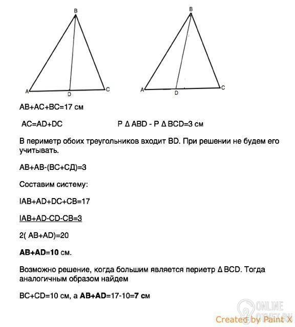 на стороне АС треугольника АВС с периметром 17см отмечена точка D периметры треугольников АВD и BCD отличаются на 3 см. найдите сумму AB+AD