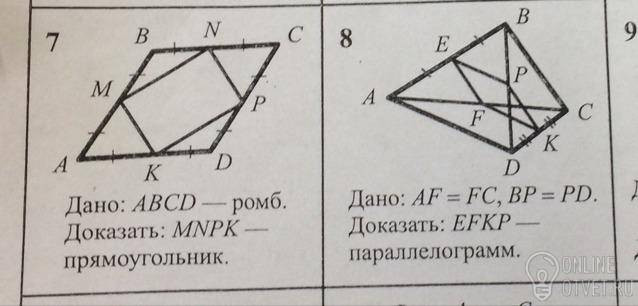 Док-во:проведем прямые через точки NK и МР?jyb пересекаются в точке О. АВСД-ромб,с прямыми углами т.к. все стороны равны,значит и углы тоже.360=90+90+90+90.теперь расмотрим т.MBN=тMNO.общая сторона и накрест.углы равны,отсюда следует что углы тоже равны по 90. VNPK-прямоугольник.Что и требовалось доказать.