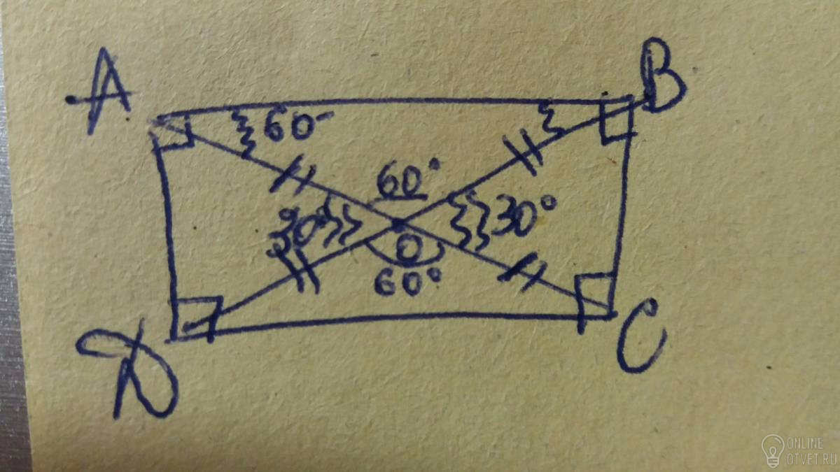 В прямоугольнике ABC,o-точка пересечения диагоналей.Угол BOC равен 60 градусов.Найдите угол BAC
