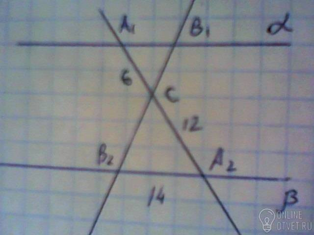 Даны две параллельные плоскости α и β. Из точки С лежащей между этими плоскостями проведены две прямые, которые пересекают плоскость α в точках А1 и В1, плоскость β в точках А2 и В2 соответственно, причем СА1 = 6дм, А1 А2 =18дм, А2В2= 14дм. Найти длину А1В1.(ОТДАЮ 40 баллов помогите плиз)