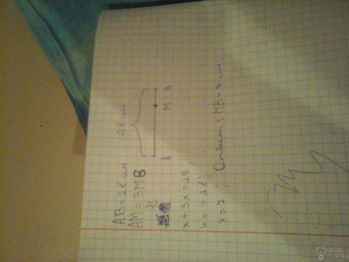 Точка М лежит на прямой АБ причем длина отрезка АБ=28см. АМ=3МБ . сделайте чертеж найдите МБ