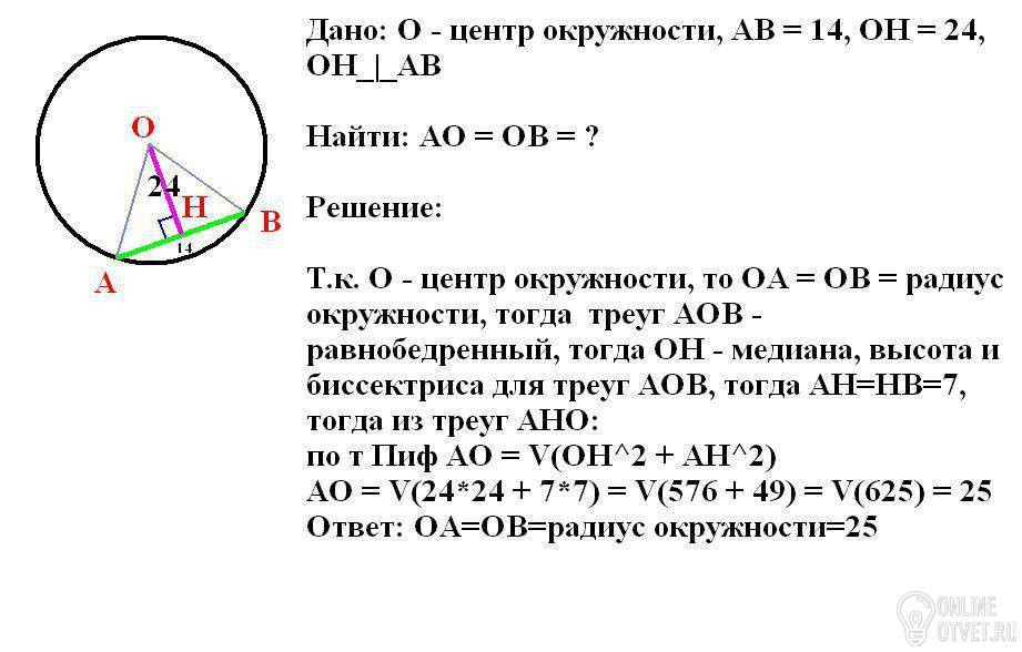 Расстояние от центра окружности до хорды длиной 14 равно 24. найдите радиус окружности