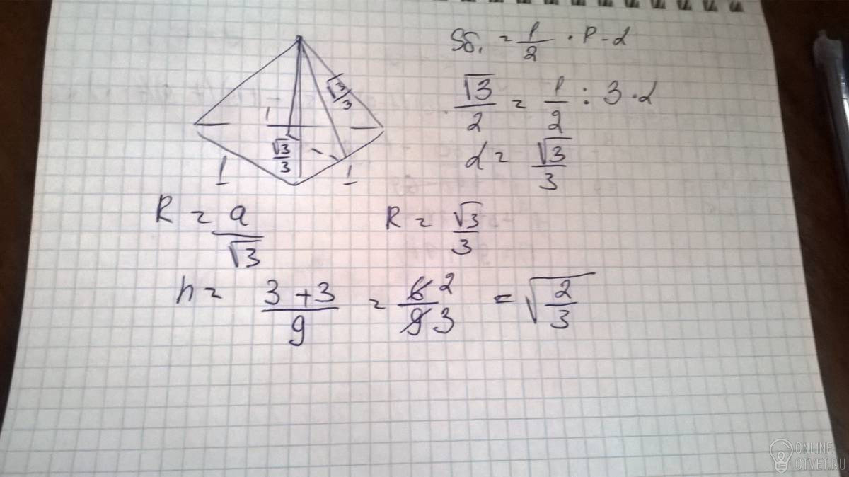 Сторона основания в правильной треугольной пирамиде равна 1 см,а её боковая поверхность √3/2 см.Найти высоту пирамиды.