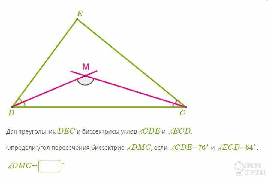 УголCEM=76:2=38°,уголECM=64:2=32°(т.к. бессектриса делит угол пополам)