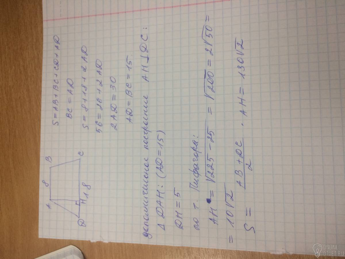 В равнобедренной трапеци основания равны 8 и 18 а периметр 56 , найдите площадь