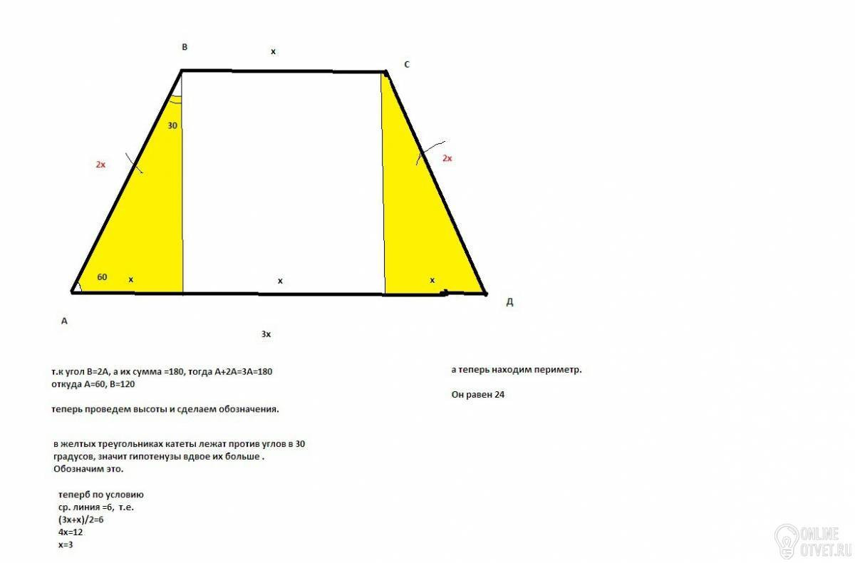 У рівнобедреной трапеції ABCD кут A удвічі меньший за кут B, основа AD у три рази більше за основу BC. Середня лінія трапеції дорівнює 6 см. Знайдіть периметр трапеції. Помогите очень надо, пожалуйста.
