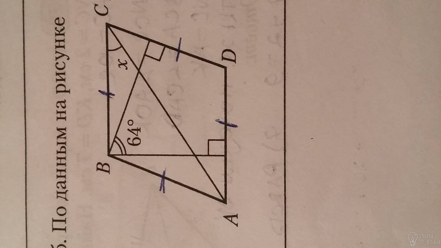 У четырехугольника сумма углов =360' поэтому угол Д= 360-(90×2+64)=116'.Угол х=(360-(116×2))/2=64