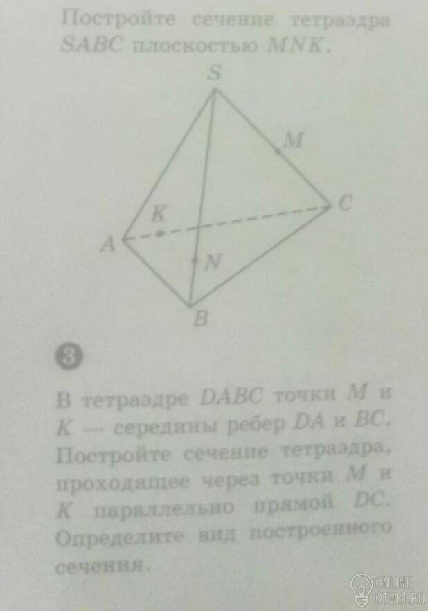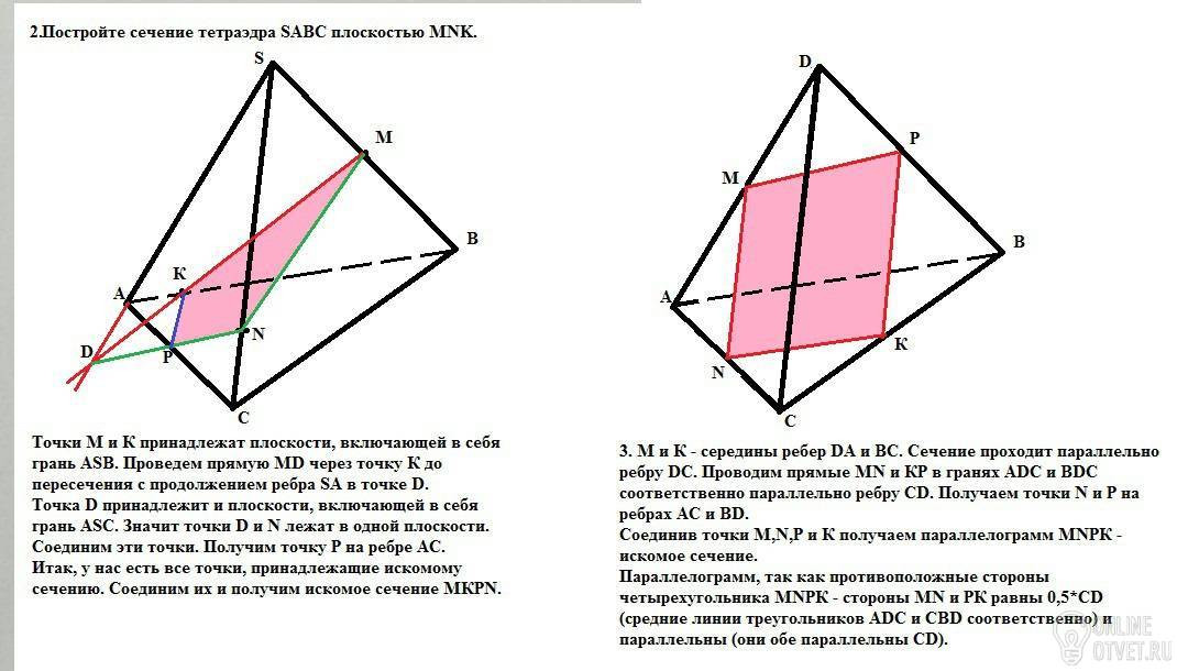 3. М и К - середины ребер DA и ВС. Сечение проходит параллельно ребру DC. Проводим прямые MN и КР в гранях ADC и BDC соответственно параллельно ребру СD. Получаем точки N и P на