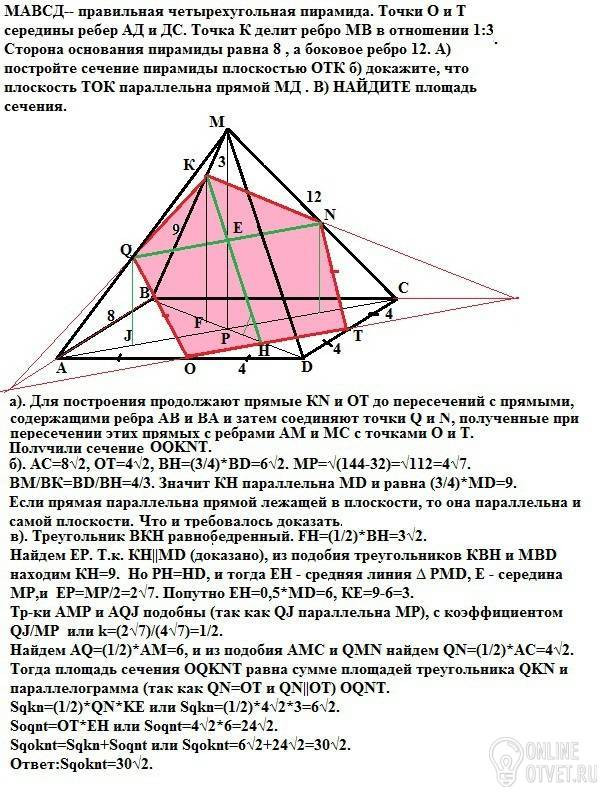 МАВСД-- правильная четырехугольная пирамида. Точки О и Т середины ребер АД и ДС. Точка К делит ребро МВ в отношении 1:3. Сторона основания пирамиды равна 8 , а боковое ребро 12. А) постройте сечение пирамиды плоскостью ОТК б) докажите, что плоскость ТОК параллельна прямой МД . В) НАЙДИТЕ площадь сечения.