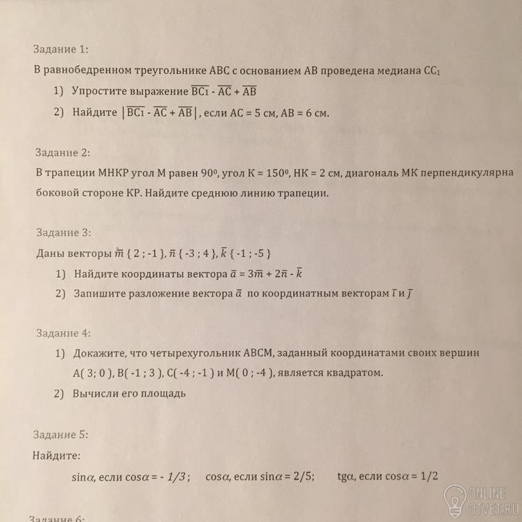 #1. 1)ВС1-АС+АВ ; ВС1-АС+АС1 ; Т.к. ВС1+АС1= АВ, то (ВС1+АС1)-АС ; АВ-АС. 2)5-4=1. 2)Угол MKH=150-90=60° Т.к. трапеция прямая, то угол HMK=30°. MK=2•2 =4 см ( по свойству прямоугольного треугольника со стороной против угла 30°). Угол KPM=30°. По тому же свойству MP=8 см. Отсюда средняя линия трапеции равна: (8+2):2=5 см #5. (на фото)