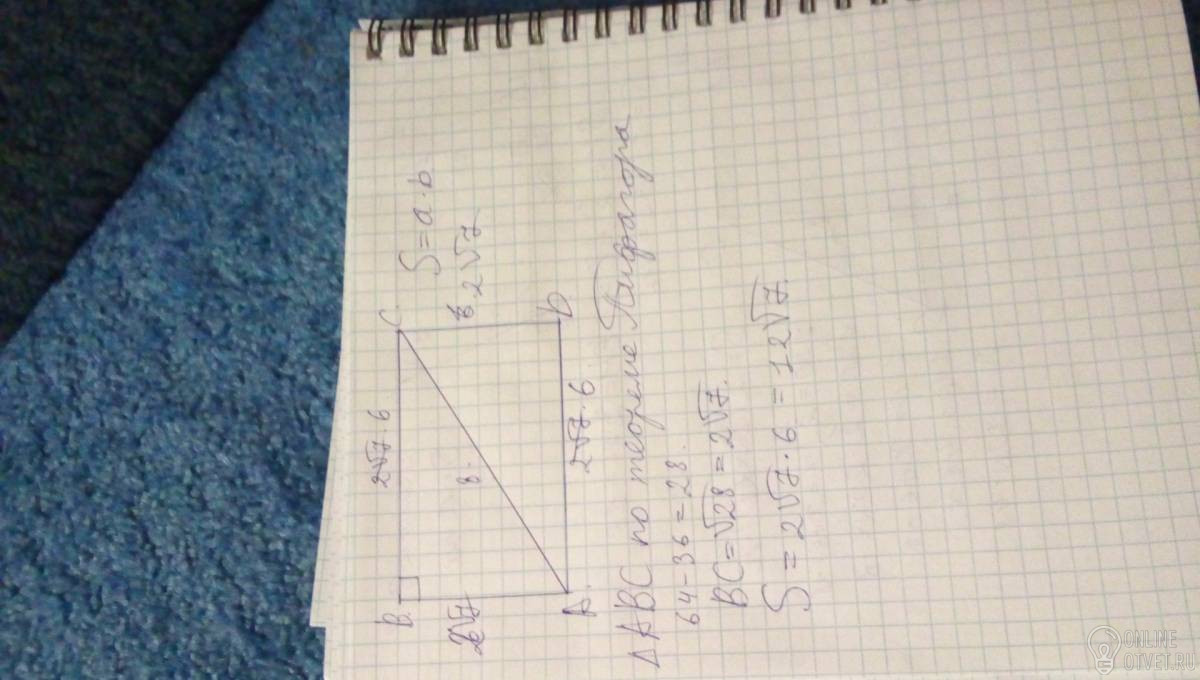 Вычислите площадь прямоугольника у которого сторона равна 6 сантиметров а диагональ 8 см
