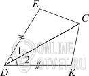 треугольники НСD и DCK равны по двум сторонам(CD - общая; DE=DK) и углу между ними(углы 1 и 2 равны).