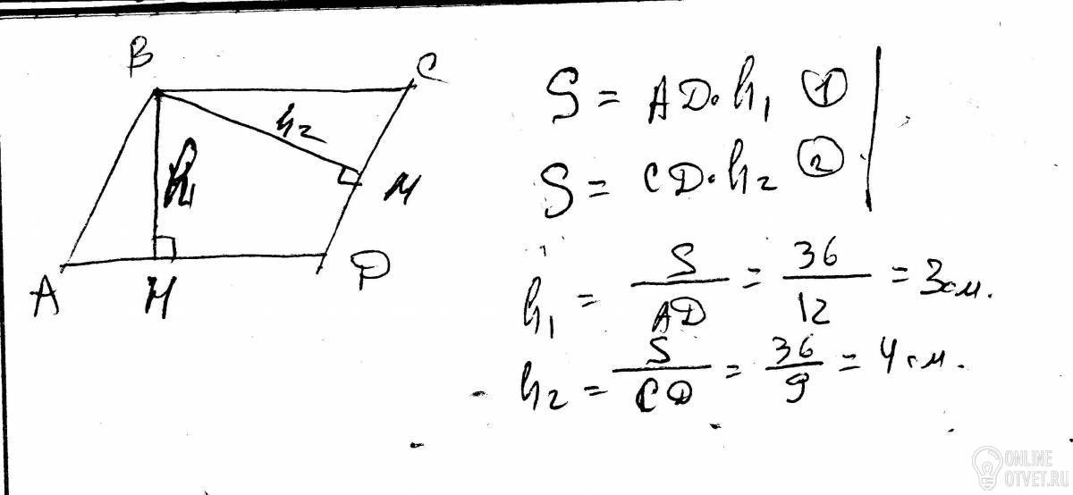 Стороны параллелограмма равны 12 см и 9 см,а его площадь равна 36 см в квадрате.Найдите высоты параллелограмма.