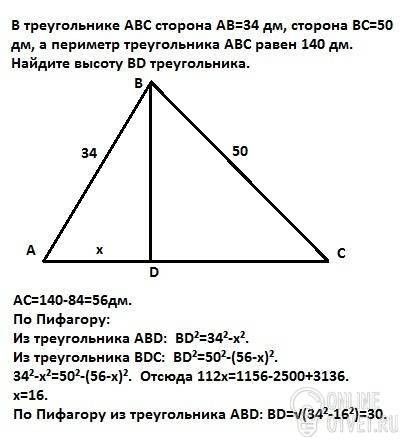 В треугольнике ABC сторона AB=34 дм, сторона BC=50 дм, а периметр треугольника ABC равен 140 дм. Найдите высоту BD треугольника.