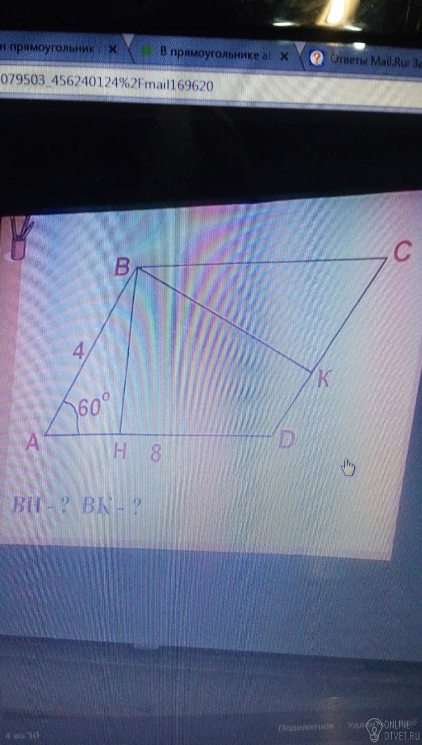 S(ABCD) = AD*BH = CD*BK ⇒ BK = AD*BH/CD = 10*2√3/4 = 5√3