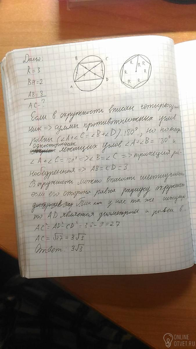 В окружность радиуса 3 вписана трапеция.Её высота равна 2, а боковая сторона 3.Найдите диагональ трапеции.