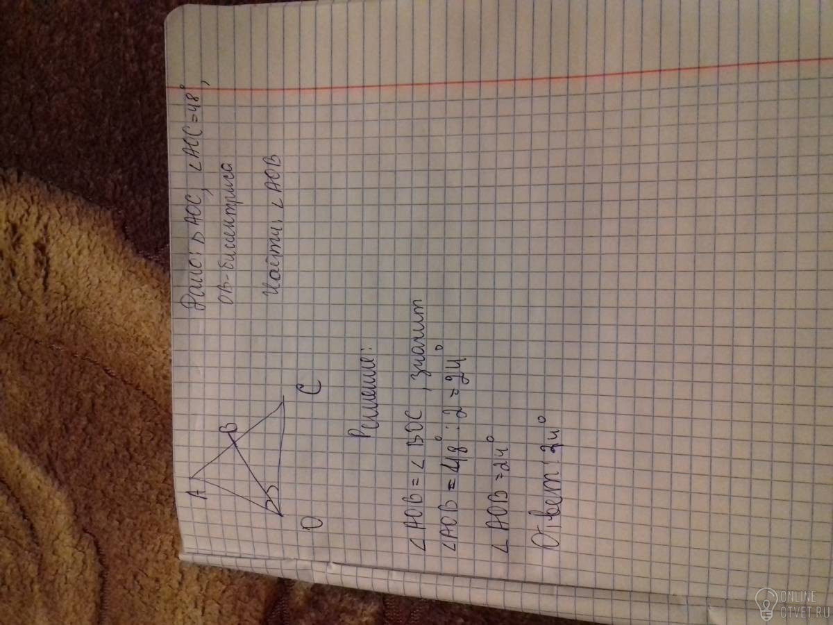Луч ОВ является биссектрисой угла АОС. Найдите угол АОВ, если угол АОС = 48 градусов