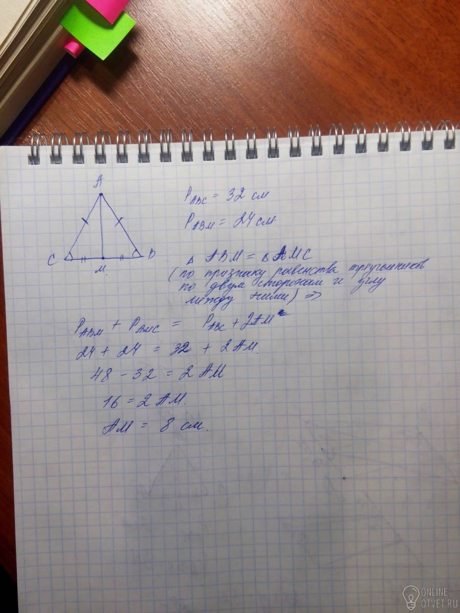 треугольника АВС равен 32см, а периметр треугольника АВМ