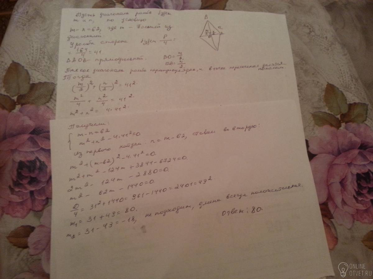 Периметр ромба равен 164, а разность длин его диагоналей равна 62. Найдите длину большей из диагоналей этого ромба.