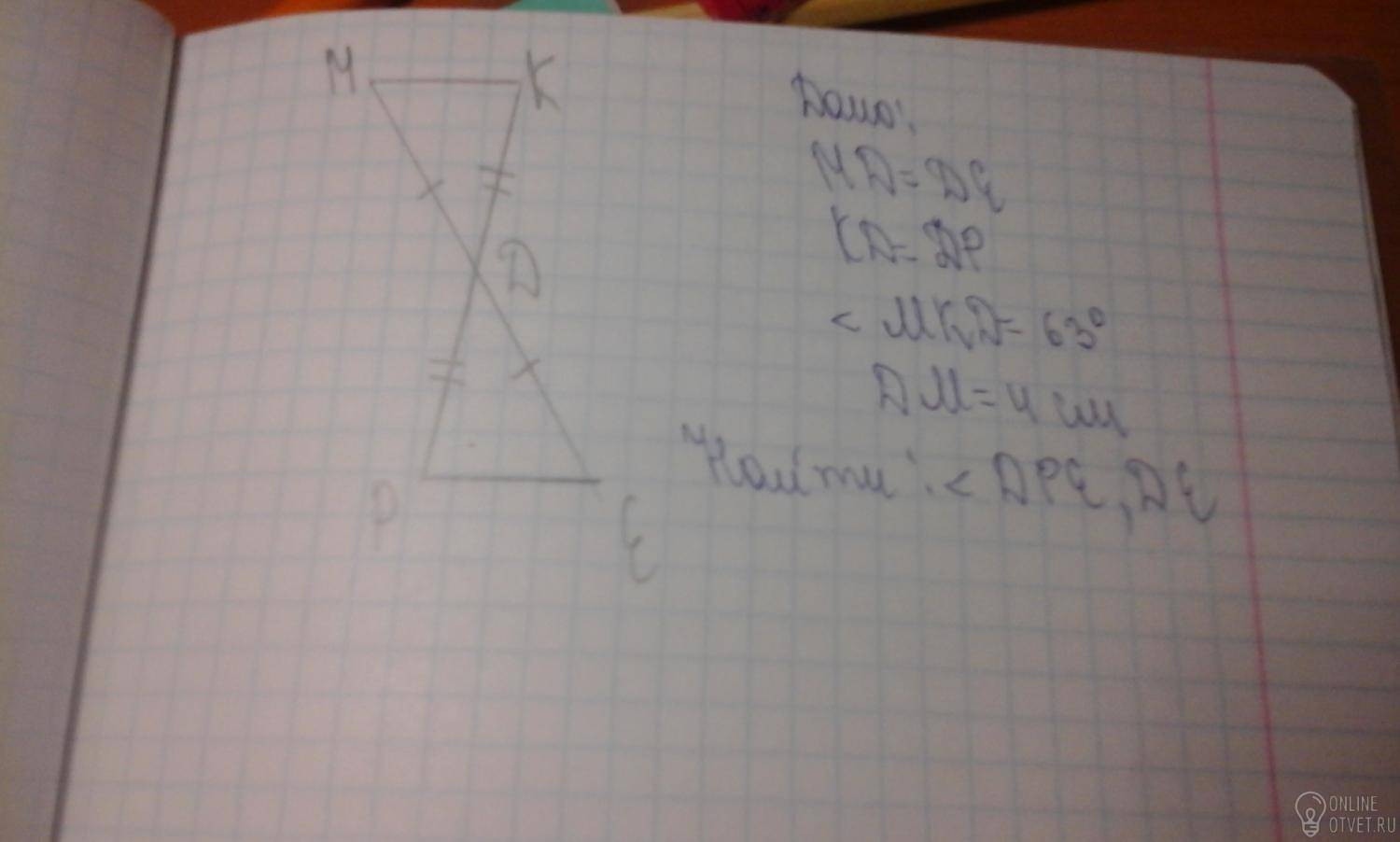 => треугольник MDK = треугольнику EDP (по 1-ому признаку равенства треугольников / по двум сторонам и углу)