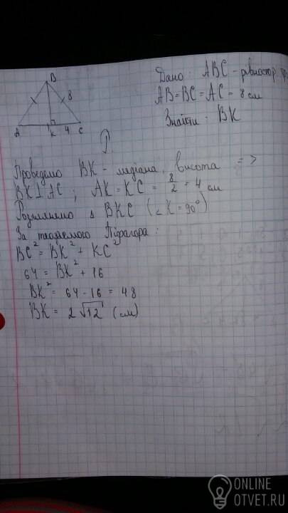 Сторона равностороннего треугольника равна 8 см. Найдите его медиану.