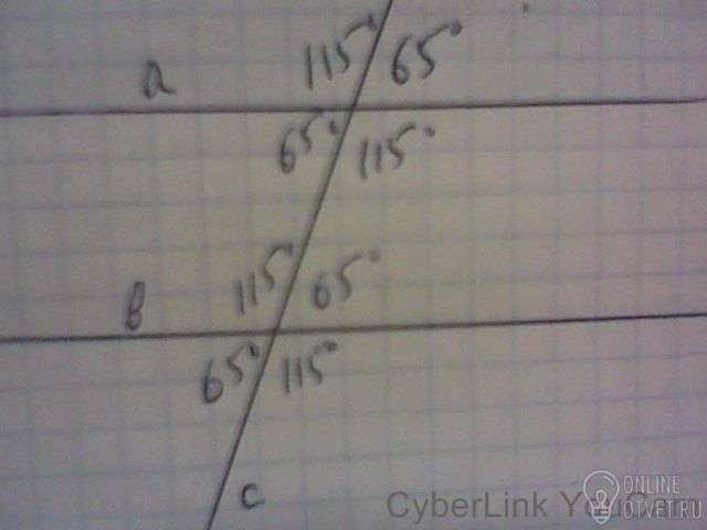 Один из углов, образовавшихся при пересечении двух параллельных прямых третьей прямой, равен 65 градусов.Найди те остольные углы..... помогите пжл!!!
