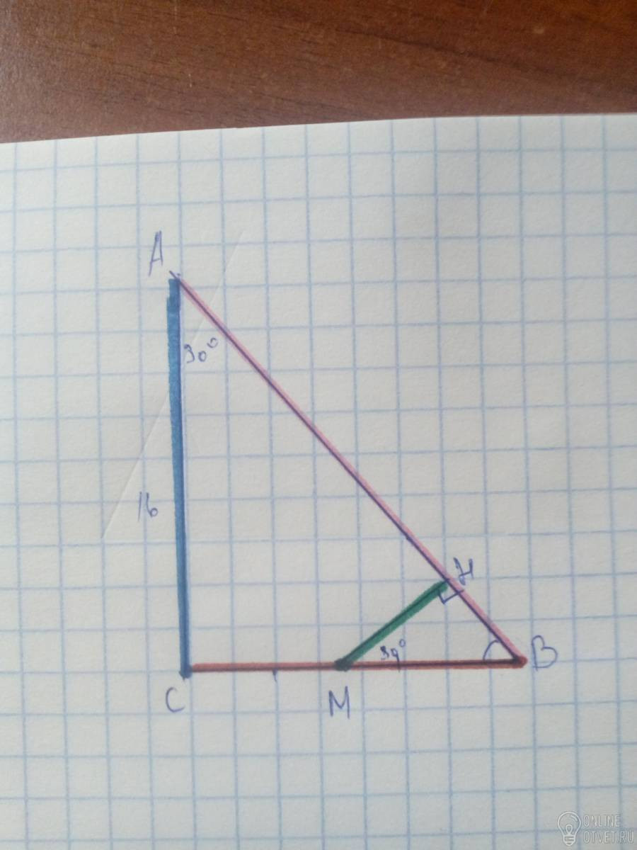В прямоугольном треугольнике ABC угол C=90 гр., угол A=30 гр., AC=16 см. Точка М - середина катета BC. Найдите расстояние от точки М до гипотенузы AB.
