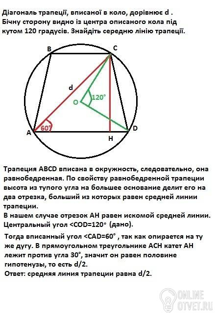Діагональ трапеції, вписаної в коло, дорівнює d . Бічну сторону видно із центра описаного кола під кутом 120 градусів. Знайдіть середню лінію трапеції.