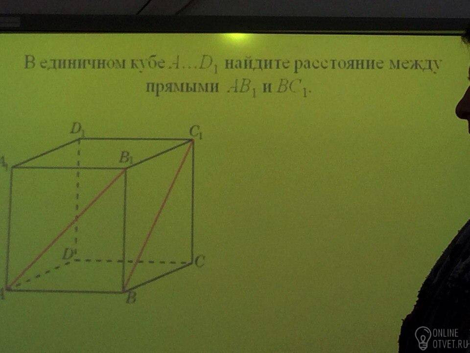 2) Находим расстояние O1EO1E:По свойствам кубаBD=BC1=DC1=2–√, O1C1=2–√2, OC1=6–√2, OO1=1BD=BC1=DC1=2, O1C1=22, OC1=62, OO1=1∠O1EC1=90∘∠O1EC1=90∘ — по построению∠OO1C1=90∘∠OO1C1=90∘ — потому что прямая OO1OO1 перпендикулярна плоскости A1B1C1A1B1C1Из прямоугольного треугольника OO1C1OO1C1sinO1C1O=OO1OC1sinO1C1O=OO1OC1Из прямоугольного треугольника EO1C1EO1C1sinO1C1O=O1EO1C1sinO1C1O=O1EO1C1Приравниваем правые части уравнений друг другуOO1OC1=O1EO1C1OO1OC1=O1EO1C1ВыражаемO1EO1EO1E=O1C1⋅OO1OC1=2–√2⋅13√2√=13–√
