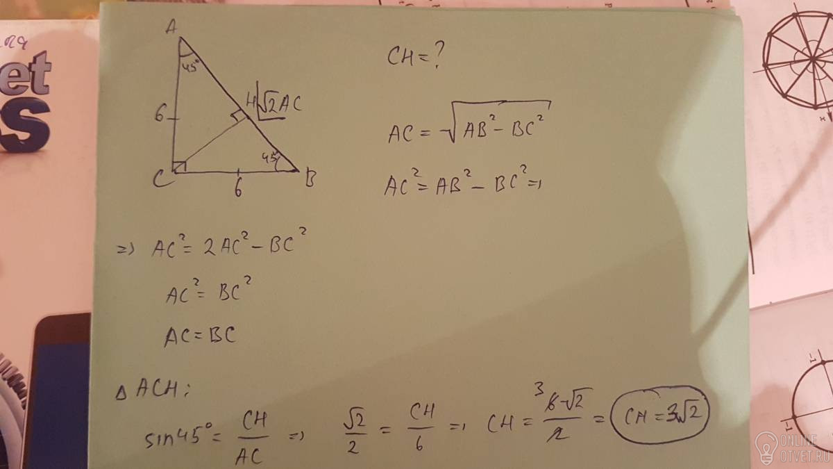 В треугольнике ABC угол C равен 90°, AB=√2 AC, BC=6. Найдите высоту CH. В ответ запишите, чему равно √2CH