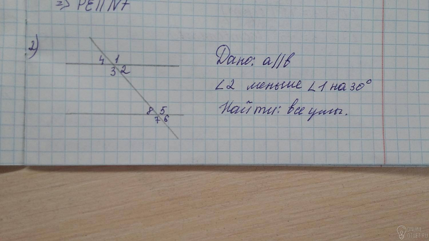 Пусть ∠2=x°, тогда, исходя из условия, ∠1=(x+30)°. Также ∠1 и ∠2 являются смежными, то есть их сумма равна 180°. Получаем x+x+30=180→2x=150→x=75. То есть ∠2=75°, а ∠1=105°. ∠1=∠3=105°, как вертикальные углы. ∠2=∠4=75°, как вертикальные углы.∠1=∠5=105°, как соответственные углы при параллельных прямых a и b и секущей. ∠4=∠8=75°, как соответственные углы при параллельных прямых a и b и секущей. ∠6=∠8=75°, как вертикальные углы. ∠7=∠5=105°, как вертикальные углы. Ответ: ∠1=105°, ∠2=75°, ∠3=105°, ∠4=75°, ∠5=105°, ∠6=75°, ∠7=105°, ∠8=75° .