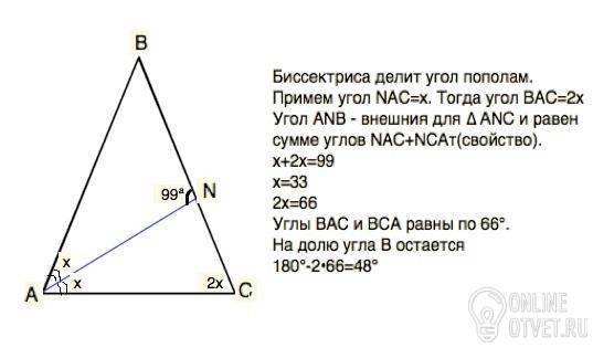 AN- биссектриса равнобедренного треугольника ABC с основанием AC. Найдите углы треугольника ABC,если уголANB=99*. please помагите