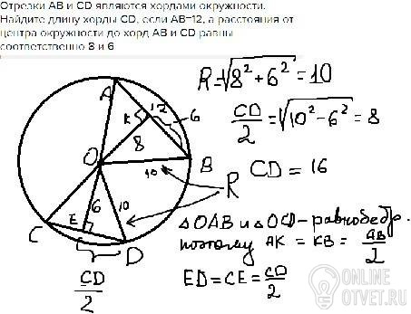 Отрезки AB и CD являются хордами окружности. Найдите длину хорды CD, если AB=12, а расстояния от центра окружности до хорд AB и CD равны соответственно 8 и 6
