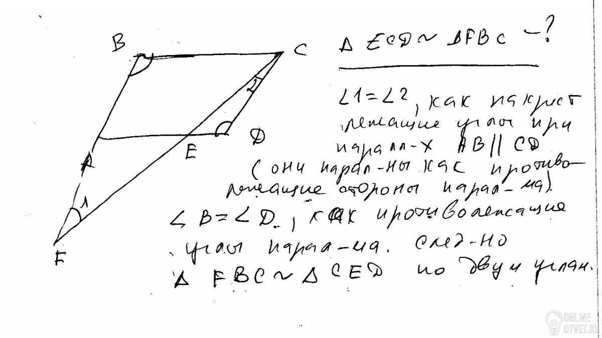 Через вершину C параллелограмма проведена прямая, пересекающая сторону AD в точке E, а продолжение стороны BA в точке F. Докажите что треугольник ECD ~(подобен) треугольнику FBC.
