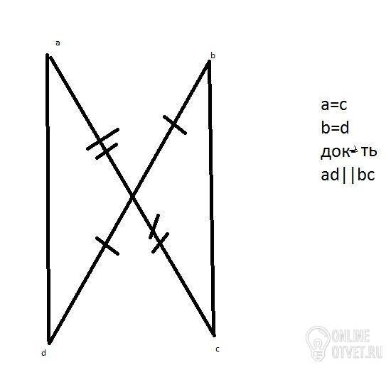 Ну попробуй например соединить d c и a b, тогда получится четыреугольник, а эти линии- диагонали, и они делятся пополам, а это свойство прямоугольника. А если это прямоугольник, то у него и стороны параллельные. Ну вроде так можно