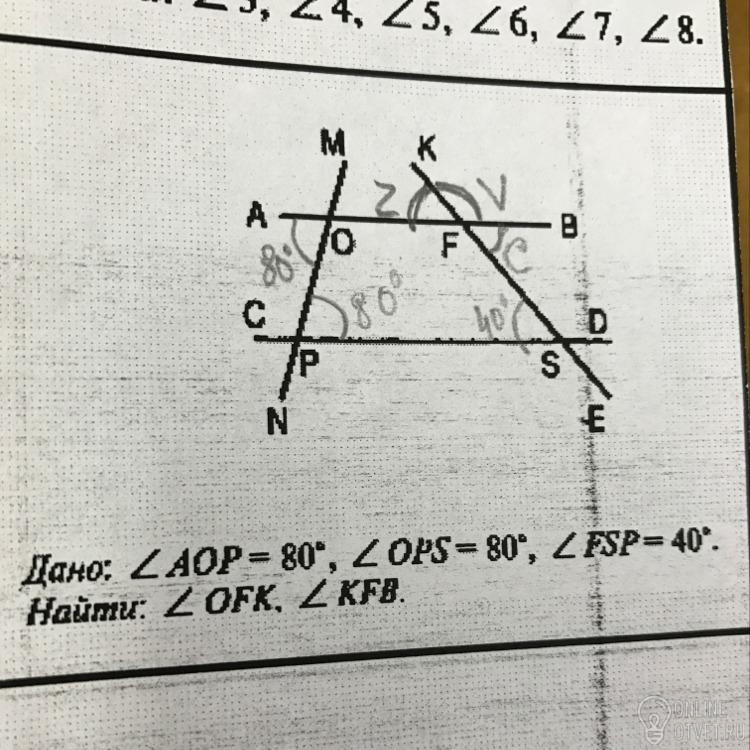 угол OFK равен 180-40=140, так как сумма односторонних углов 180 градусов при секущей ЕК;
