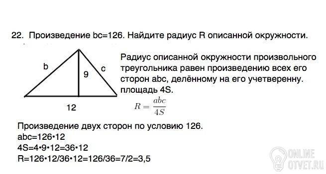Радиус описанной окружности произвольного треугольника равен произведению его сторон abc, делённому на его учетверенную. площадь 4S.