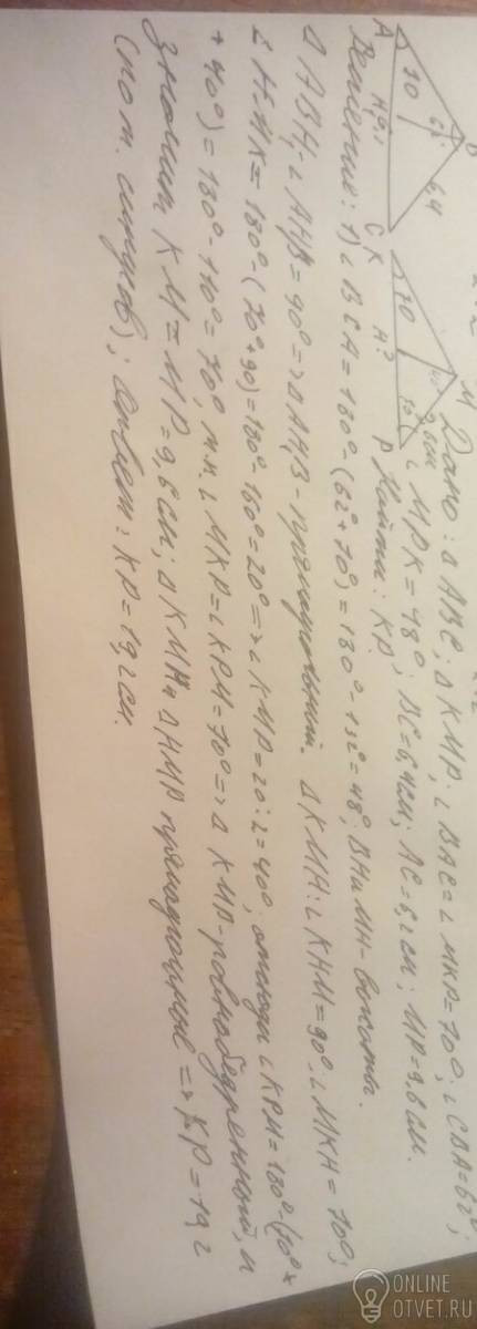 Даны треугольники АВС и КМР . угол А=К=70 градусов, угол В=62 градуса, угол Р =48 градусов, ВС= 6,4 см, АС=6,2 см, МР= 9,6 см. Найдите КР