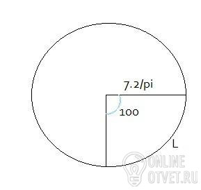 В окружности радиуса 7,2/п найдите длину дуги, содержащей 100 градусов