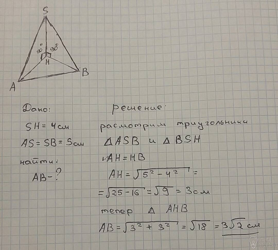 Через точку, удаленную от плоскости на расстояние 4см, проведены к этой плоскости две наклонные по 5см каждая. Угол между проекциями этих наклонных равен 90°. Найдите расстояние между основаниями наклонных.