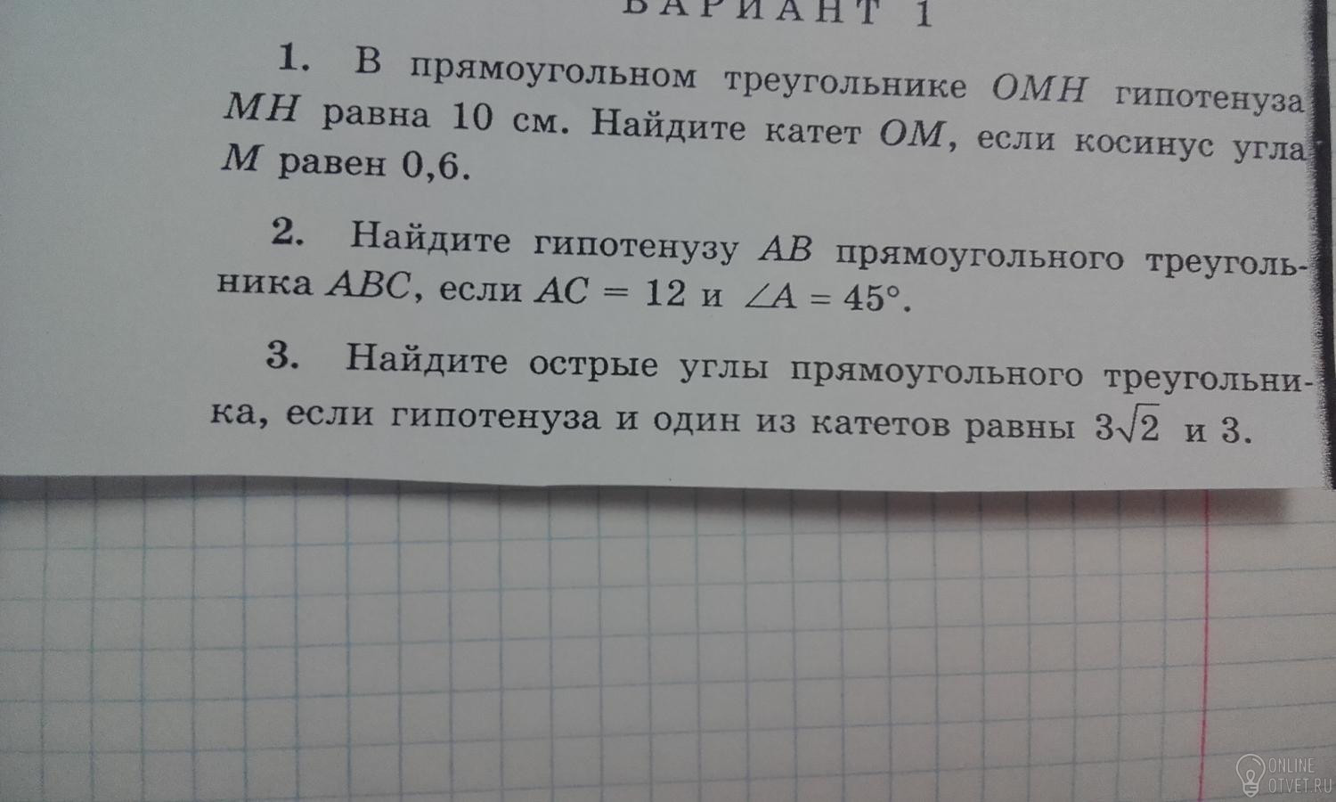 №1 треугольник АВС, уголС=90, АВ=3*корень2, ВС=3, АС=корень(АВ в квадрате-ВС в квадрате)=18-9)=3, треугольник АВС прямоугольный, равнобедренный, Ас=ВС=3, уголА=уголВ=90/2=45, №2 треугольник АВС, уголС=90, АС=12, уголА=45, уголВ=90-уголА=90-45=45, треугольник равнобедренный, АС=ВС=12, АВ=корень(АС в квадрате+ВС в квадрате)=корень(144+144)=12*корень2 №3 треугольник ОМН, уголО=90, МН=10, cosM=0,6, ОМ=МН*cosM=10*0,6=6