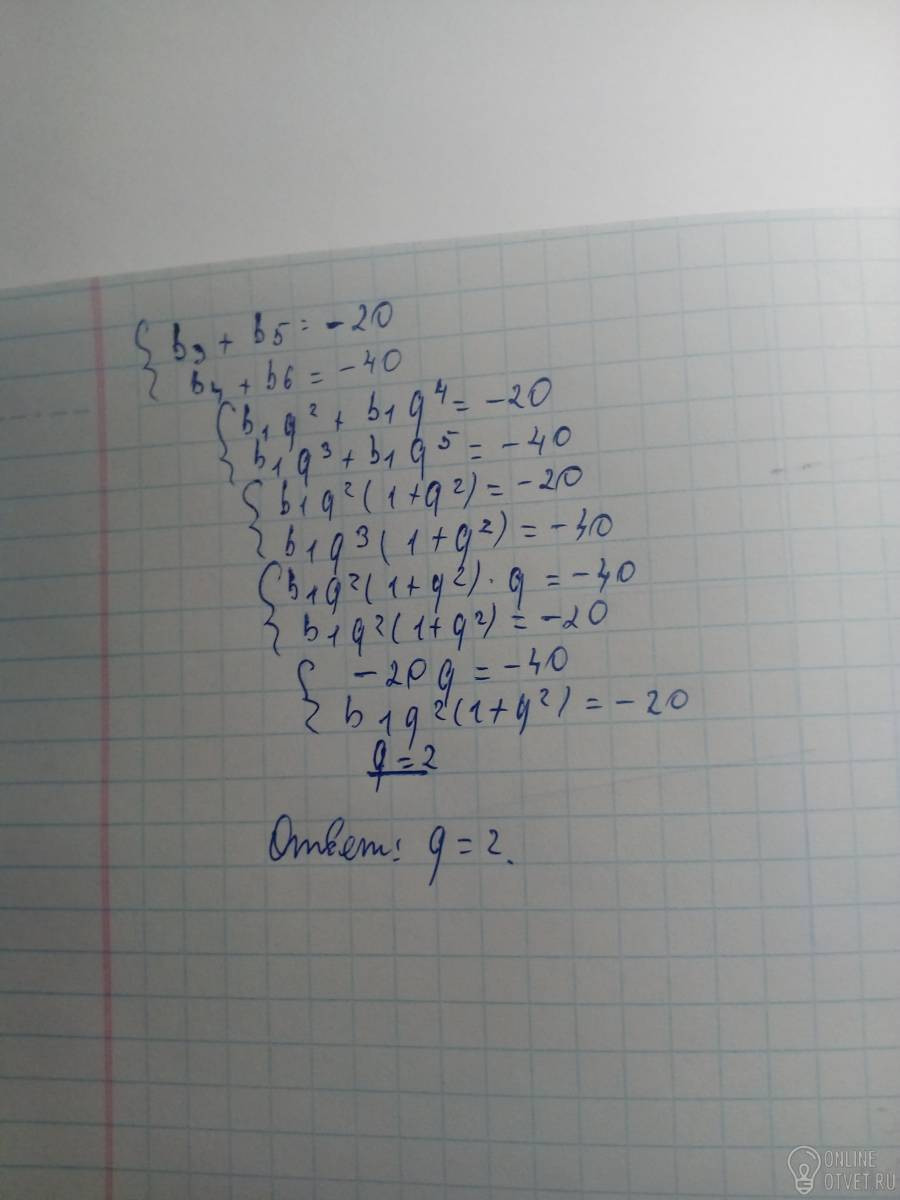 Сумма третьего и пятого членов геометрической прогрессии равна -20, а сумма четвертого и шестого равна - 40. Найдите знаменатель прогрессии