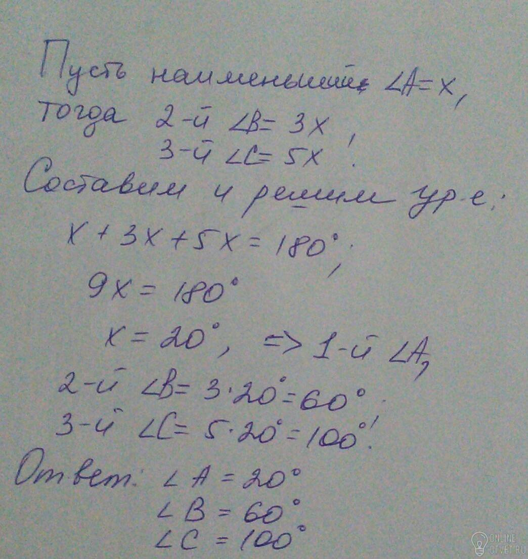 Углы триугольника относительно как 1:3:5.Найти все углы данного триугольника