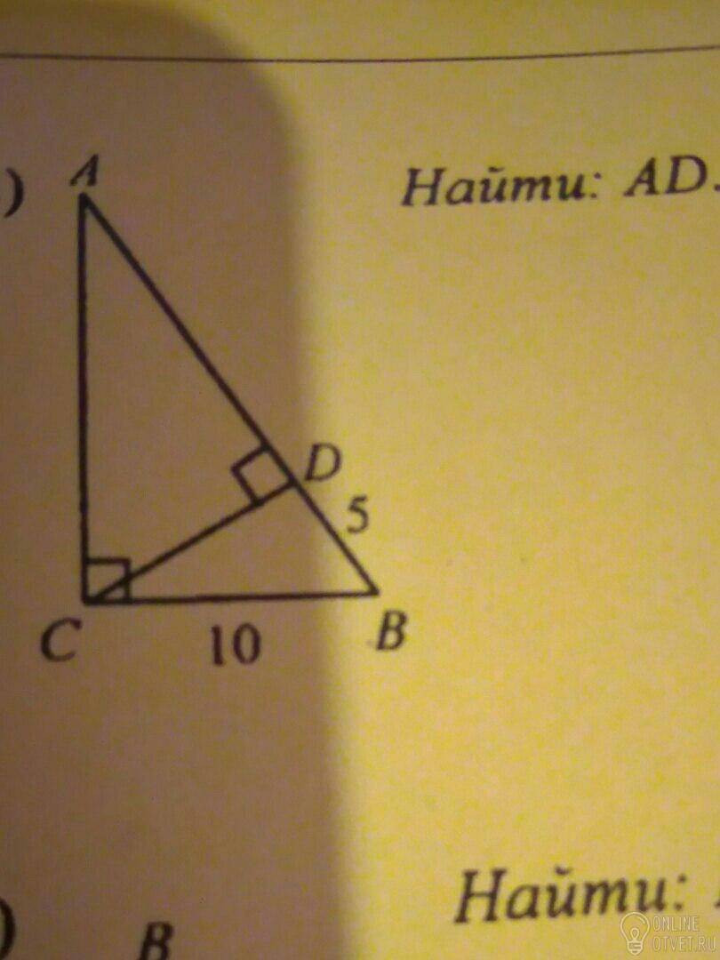 АВ/СВ=СВ/DB ( треугольники АВС и АВD подобны по трём углам). Отсюда: (АD + 5):10=10:5. AD+5=20, AD=15.